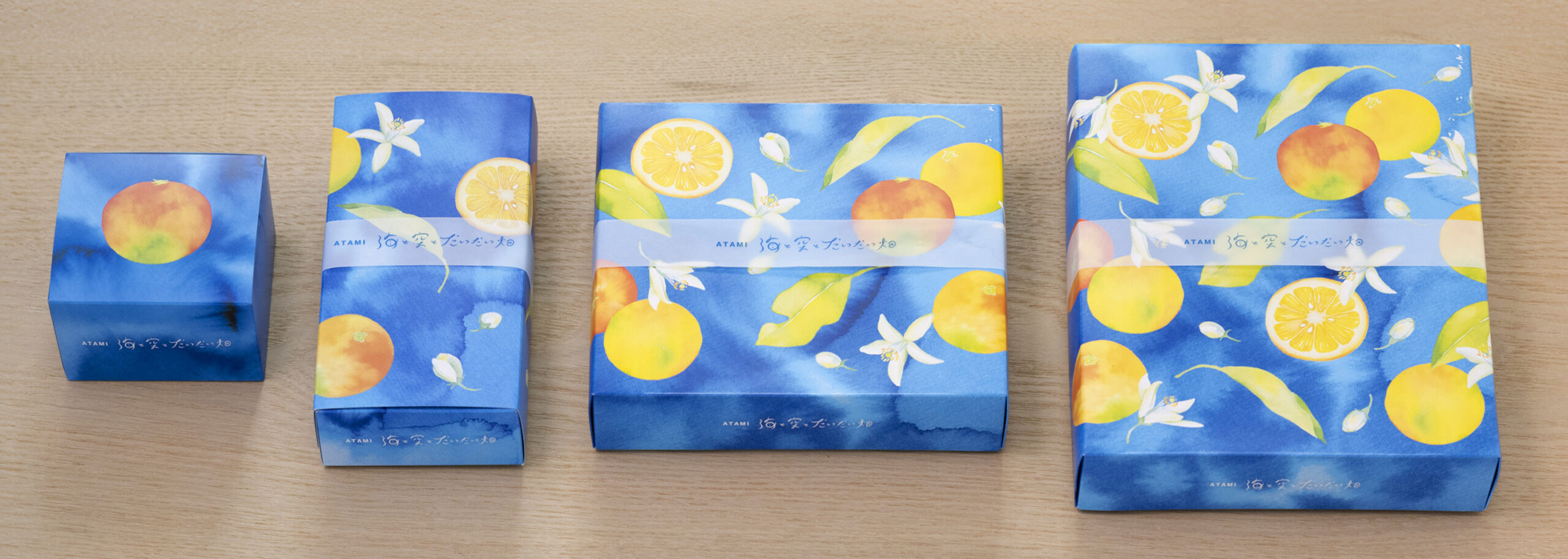 Artist:富岡美紀(熱海出身) 生まれ育った海と空の“熱海の青”に、だいだいの果実・葉・花を重ねた装いです。